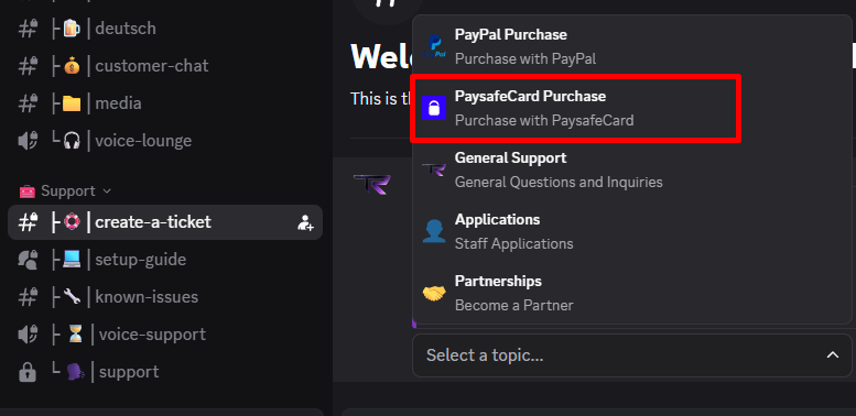 Now go back to the Discord server. Go to the "#├🛟│create-a-ticket" channel and use the bot to create a ticket in the Alternative Payments section.